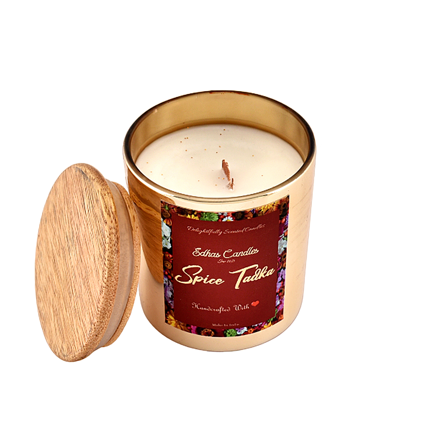 Edhas Luxury Wooden Wick Scented Candle – Gold Glass Jar (Spice Tadka Fragrance)